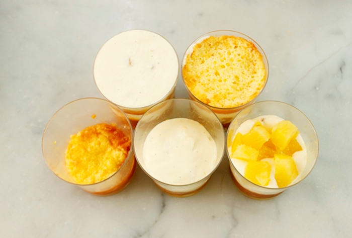 2.バヴァロワーズを少量流し、コンポートアナナスを26g入れる。